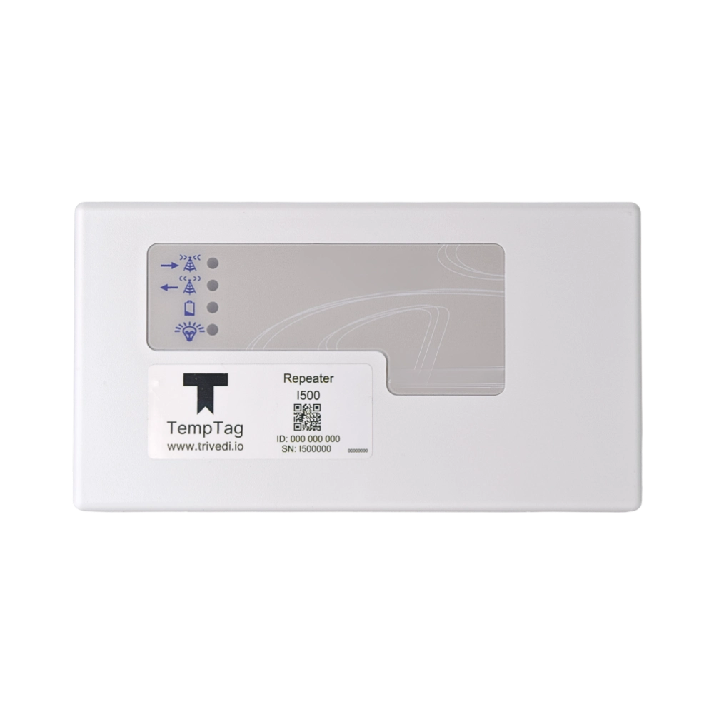 The TempTag™ i500 Repeater is a line-powered 900 MHz repeater-receiver that decodes and retransmits signals from EchoStream® transmitters. It functions as a range expander by extending wireless signal coverage for large commercial sites and multi-building campuses. The i500 includes an onboard lithium-ion battery and can be installed in an outdoor weatherproof enclosure when environmental protection is required.
