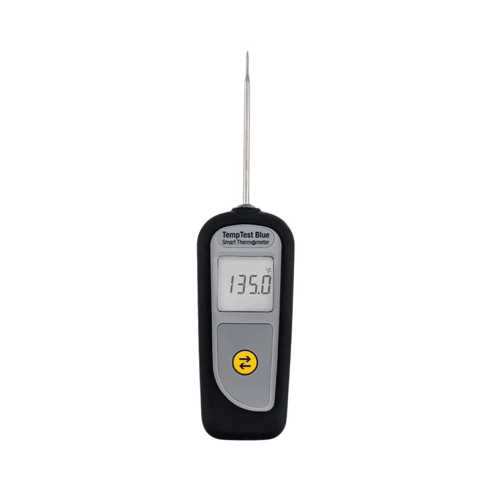 The TP-300 TempTest Blue is a wireless Bluetooth thermometer with a built-in display screen and a fixed-position probe. It is designed for convenient and consistent temperature measurement in food safety and monitoring applications.